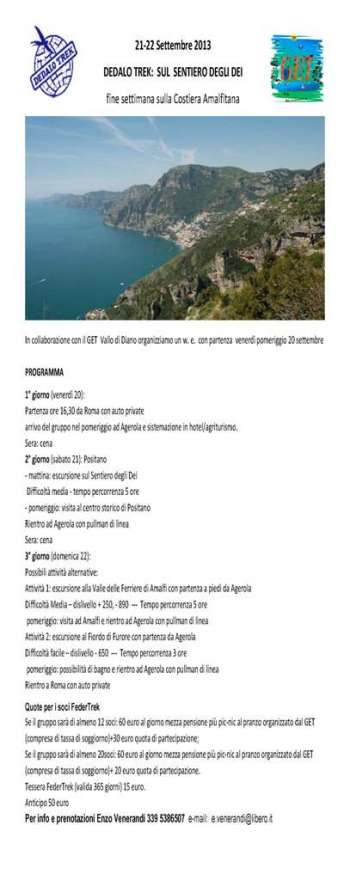 Domenica il fiordo di Furore o la valle delle Ferriere da Agerola. In collaborazione con il GET Vallo di Diano. Posti limitati. Se il gruppo sarà di almeno 12 soci: 60 euro al giorno mezza pensione più pic-nic al pranzo organizzato dal GET (compresa di tassa di soggiorno)+30 euro quota di partecipazione;