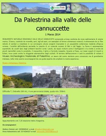 MONUMENTO NATURALE REGIONALE VALLE DELLE CANNUCCETE comprende un’area costituita da rocce sedimentarie di origine marina. Il bosco, costituito da roverelle, cerri, tigli ed aceri, con esemplari di forme e dimensioni notevoli, è attraversato da un fitto reticolo di sentieri e mulattiere in cui convergono alcune sorgenti incanalate in un acquedotto sotterraneo risalente all'epoca romana. L’umidità dell'ambiente permette la crescita di un notevole numero di felci e del faggio. La fauna è rappresentata soprattutto da uccelli tipici degli ambienti boschivi come i picchi, da rapaci notturni come il barbagianni e la civetta e anche da piccoli mammiferi come lo scoiattolo, il moscardino, il ghiro e l'arvicola rossastra. Accanto al fosso, sui massi coperti di muschi e licheni, trova posto anche la sfuggente salamandrina dagli occhiali.Al termine dell’escursione vi sarà la possibilità di visitare il Museo Archeologico Nazionale di Palestrina, un tesoro del nostro territorio poco conosciuto ma di grandissimo interesse, nella visita saremo accompagnati da una guida esperta che amplierà l’esperienza visiva.