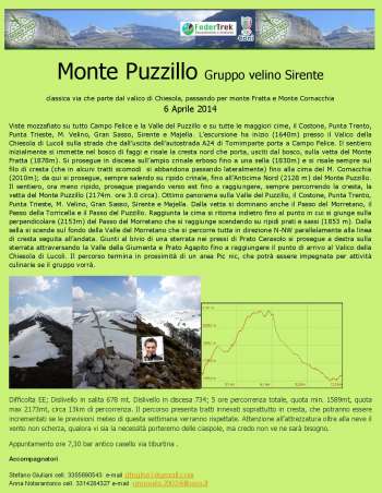 Viste mozzafiato su tutto Campo Felice e la Valle del Puzzillo e su tutte le maggiori cime, il Costone, Punta Trento, Punta Trieste, M. Velino, Gran Sasso, Sirente e Majella. L'escursione ha inizio (1640m) presso il Valico della Chiesola di Lucoli sulla strada che dall'uscita dell'autostrada A24 di Tornimparte porta a Campo Felice. Il sentiero inizialmente si immette nel bosco di faggi e risale la cresta nord che porta, usciti dal bosco, sulla vetta del Monte Fratta (1878m). Si prosegue in discesa sull'ampio crinale erboso fino a una sella (1830m) e si risale sempre sul filo di cresta (che in alcuni tratti scomodi si abbandona passando lateralmente) fino alla cima del M. Cornacchia (2010m); da qui si prosegue, sempre salendo su ripido crinale, fino all'Anticima Nord (2128 m) del Monte Puzzillo. Il sentiero, ora meno ripido, prosegue piegando verso est fino a raggiungere, sempre percorrendo la cresta, la vetta del Monte Puzzillo (2174m. ore 3.0 circa). Ottimo panorama sulla Valle del Puzzillo, il Costone, Punta Trento, Punta Trieste, M. Velino, Gran Sasso, Sirente e Majella. Dalla vetta si dominano anche il Passo del Morretano, il Passo della Torricella e il Passo del Puzzillo. Raggiunta la cima si ritorna indietro fino al punto in cui si giunge sulla perpendicolare (2153m) del Passo del Morretano che si raggiunge scendendo su ripidi prati e sassi (1853 m). Dalla sella si scende sul fondo della Valle del Morretano che si percorre tutta in direzione N-NW parallelamente alla linea di cresta seguita all'andata. Giunti al bivio di una sterrata nei pressi di Prato Cerasolo si prosegue a destra sulla sterrata attraversando la Valle della Giumenta e Prato Agapito fino a raggiungere il punto di arrivo al Valico della Chiesola di Lucoli. Il percorso termina in prossimità di un area Pic nic, che potrà essere impegnata per attività culinarie se il gruppo vorrà.escursione