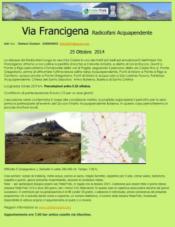 Giunti a Ponte a Rigo percorriamo il fondovalle della val di Paglia, seguendo il percorso della via Cassia fino a Ponte Gregoriano, prima di affrontare l'ultima breve salita verso Acquapendente. Punti di ristoro a Ponte a Rigo e Centeno, acqua anche a Ponte Gregoriano. Partenza Radicofani, Chiesa di San Pietro Arrivo Acquapendente, Chiesa del Santo Sepolcro